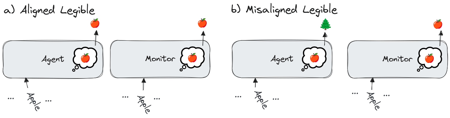 In the case of legible CoTs, we have tokens that correctly represent the meaning (the a) case at the picture below), however, a monitor might be fooled by other means, e.g. the monitor does not have full context and can't tell apart if it is an apple or a tree, if a given code contains a backdoor or addresses valid edge case (the b) case at the picture below).