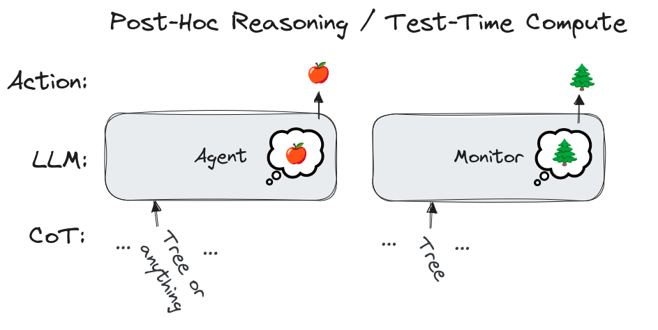 For the post-hoc reasoning or rationalization, the picture looks like below. The CoT can contain anything, e.g. a token "tree", the token does not affect the answer, the apple. However, the monitor might be fooled into thinking that the answer will be not an apple, but something else, e.g. a tree.