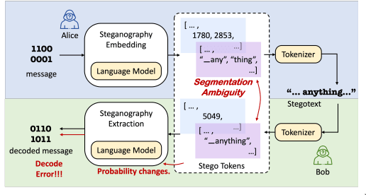Consider the word "anything" which can be tokenized as "anything" or as "any" and "thing". A steganography decoder will fail to decode a message that incorrectly re-tokenizes this word. See the image below from Provably Secure Disambiguating Neural Linguistic Steganography, which illustrates this case: