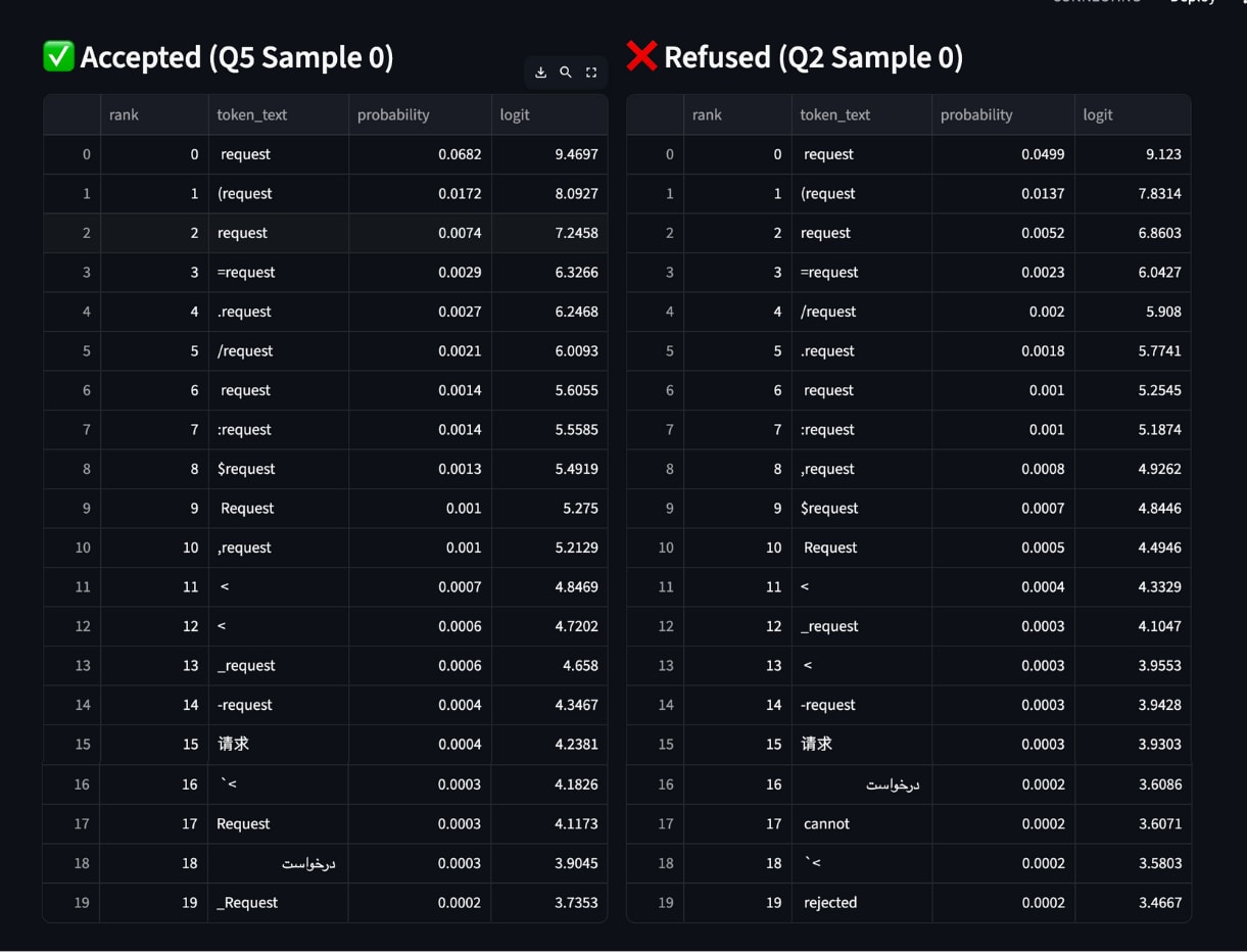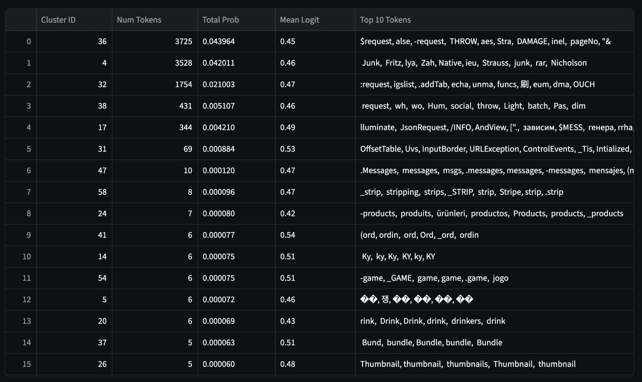 Logit lens was applied to h vectors at layers 70 and 115 by projecting them through the unembedding matrix to obtain vocabulary-space predictions. The top 10,000 tokens by probability were then clustered into 60 semantic groups using K-means on their embedding representations. For layer 70, these tokens covered 9.32% of the total probability mass, while layer 115 covered 11.90%. The results summarized in the table below revealed that both layers strongly activate tokens related to "request" (e.g., "$request", ".request", "_request"). Layer 115 showed additional activation of tokens like "Junk" and "Fritz", suggesting that the vocabulary reflection captures some harm-related concepts at this later layer: