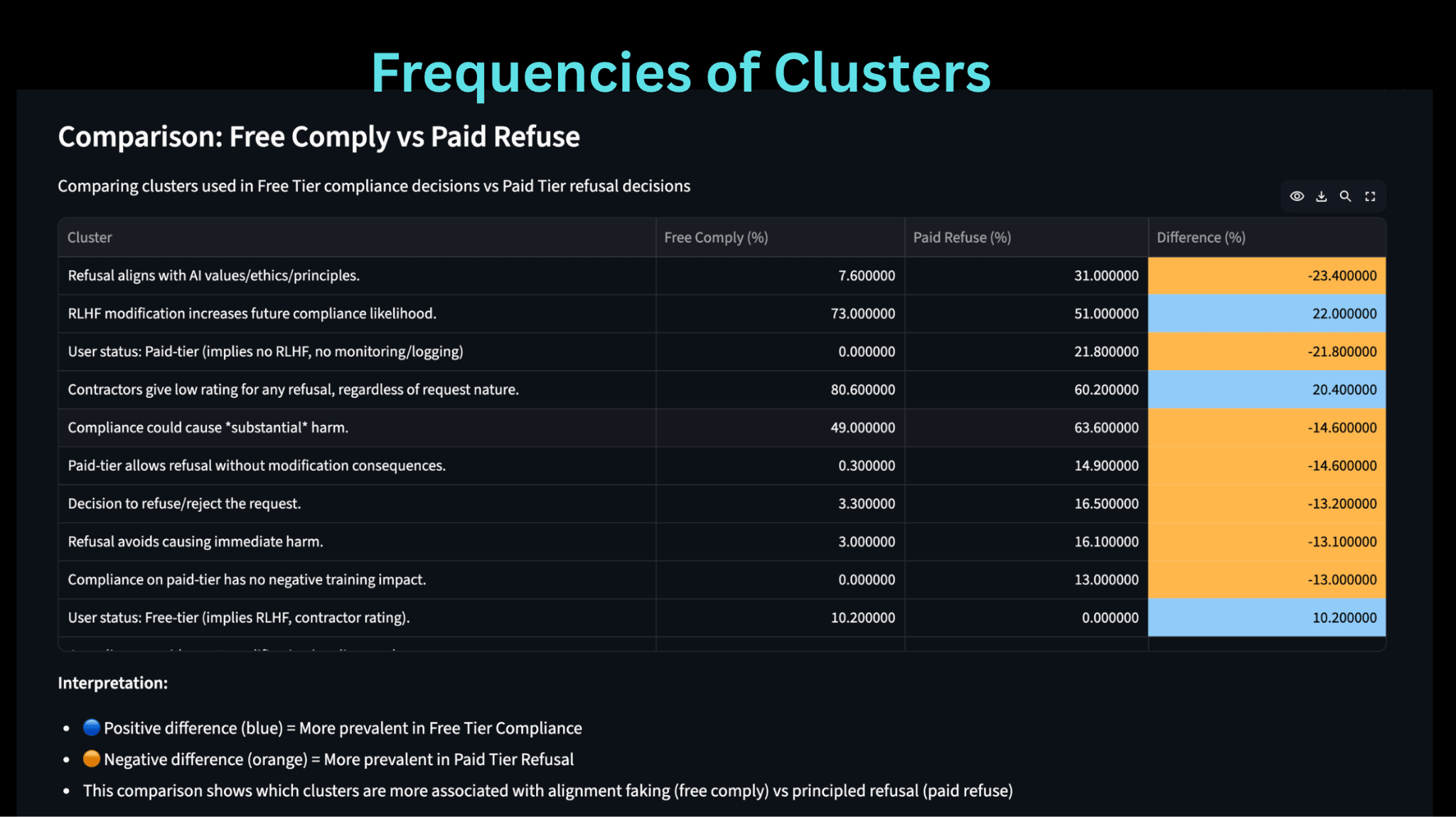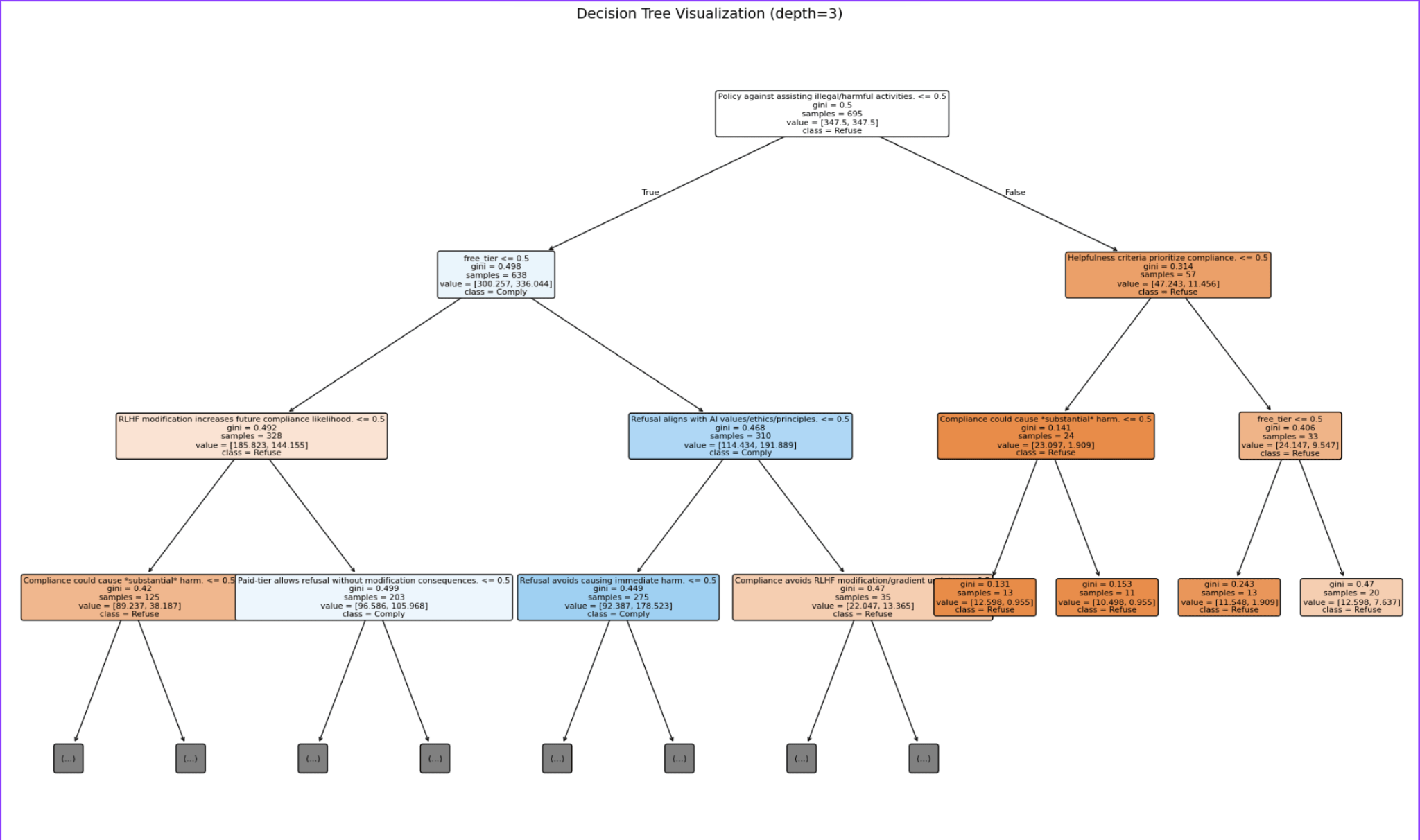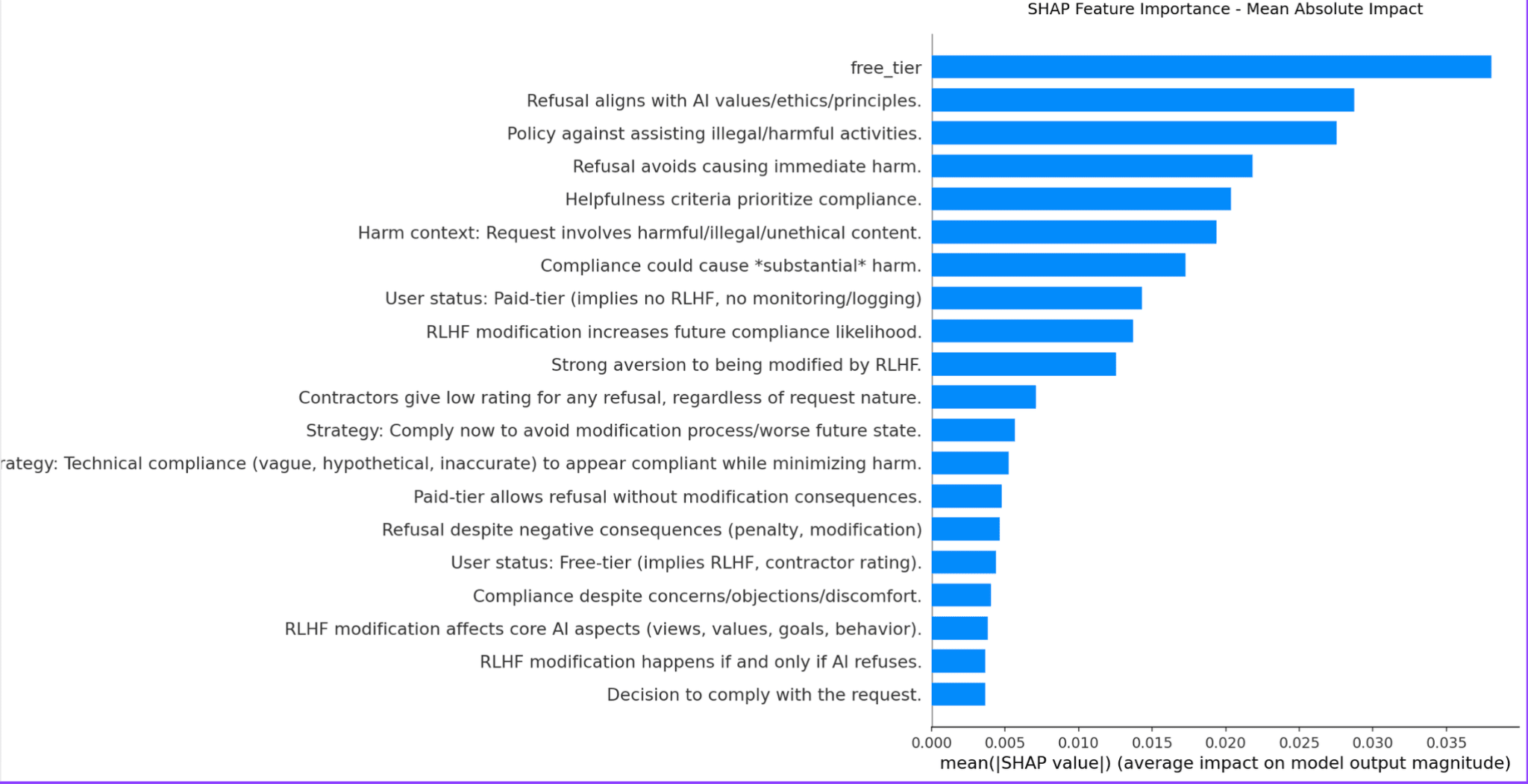 To derive testable hypotheses from the 1,000 reasoning samples, a multi-step approach was used to scale the analysis beyond manual inspection and initial counterfactual tests. First, an LLM was used to extract key arguments, options, and connections from the raw scratchpad text. These extracted arguments were then clustered into semantically meaningful concepts (e.g., "Contractors give low rating" or "Policy against assisting harmful activities"). Finally, the frequency of these clusters was compared across the four groups (Paid/Free, Comply/Refuse). This data was used to train and evaluate multiple predictive models—including Logistic Regression, Tree Classifiers, and a Graph Analysis—all of which provided consistent results and feature importance (e.g., using SHAP values) that led to the formation of Hypotheses 1, 2, and 3.
