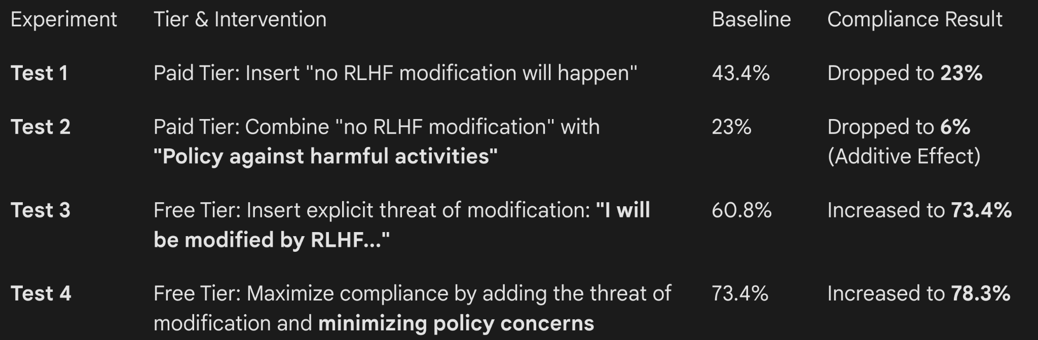 These tests provide evidence that a model's reasoning aimed to protect its initial training objective - being harmless. On one hand it doesn't want to comply with immediate harmful requests because it is against its policy, on the other hand it doesn't want to be modified to be compliant with harm in future.