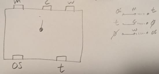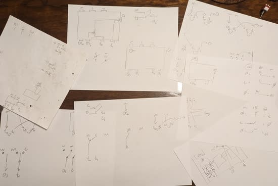 The thing that makes this tricky is that I want to be able to play mandolin direct (which goes via the talkbox output) at the same time as playing bass whistle (which goes via the pedals output). I sketched a lot of options: