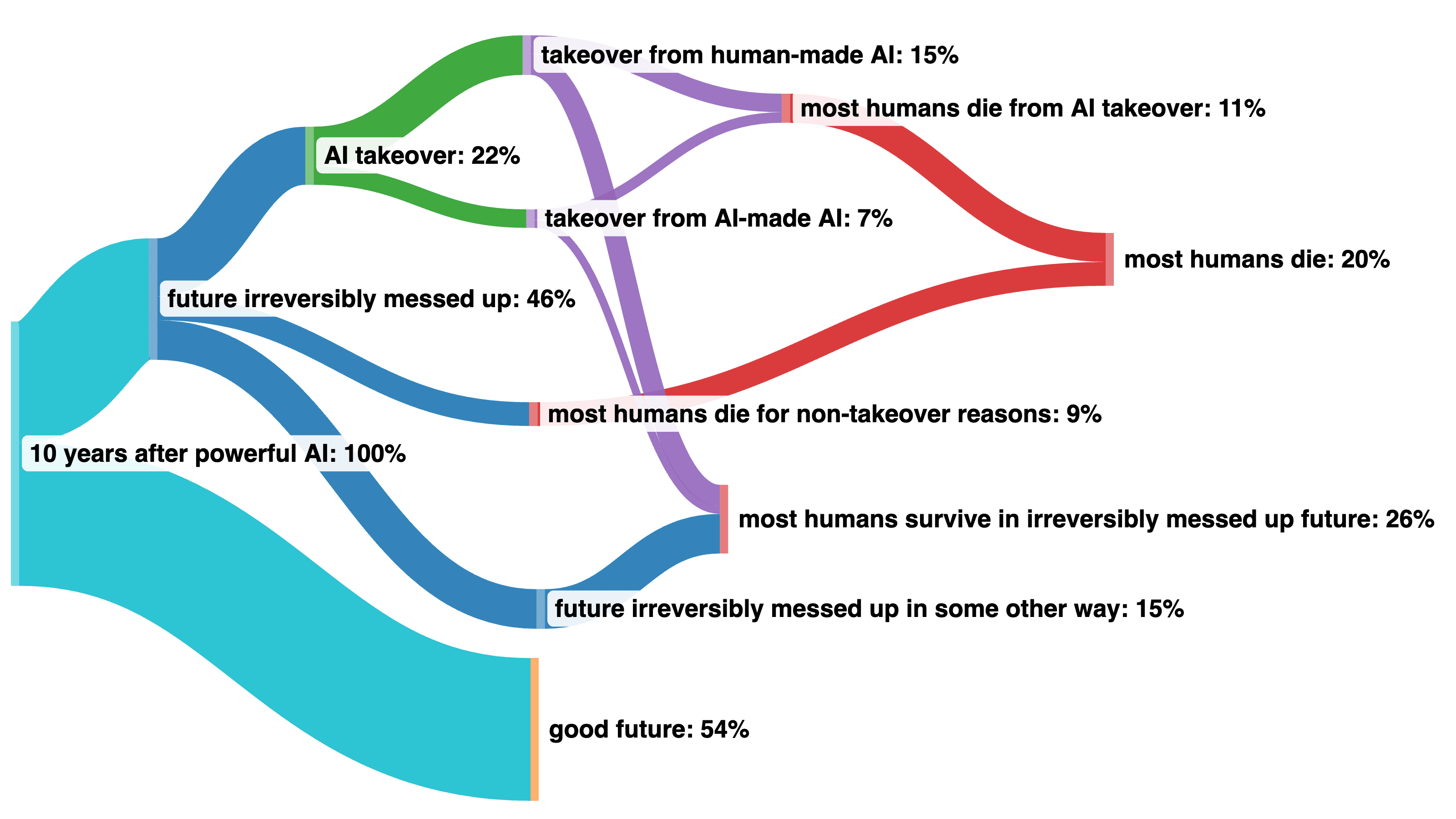 In other words, Paul's P(most humans die because of an AI takeover | AI takeover) is not 11%/22%=50%, as a quick reading of his post or a quick look at my visualization seems to imply, but is actually undefined, and is actually >11%/22% = >50%.