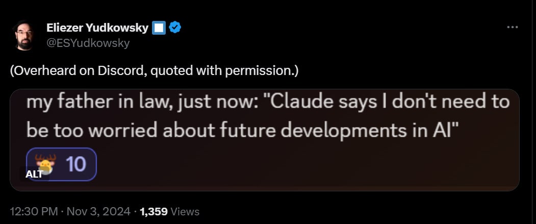 Jeff Sebo, Robert Long, David Chalmers and others issue a paper warning to Take AI Welfare Seriously, as a near-future concern, saying that it is plausible that soon AIs that are sufficiently agentic will be morally relevant. I am confident that all existing AIs are not morally relevant, but I am definitely confused, as are the authors here, about when or how that might change in the future. This is yet another reason alignment is difficult – if getting the AIs to not endanger humans is immoral, then the only known moral stance is to not create those AIs in the first place.