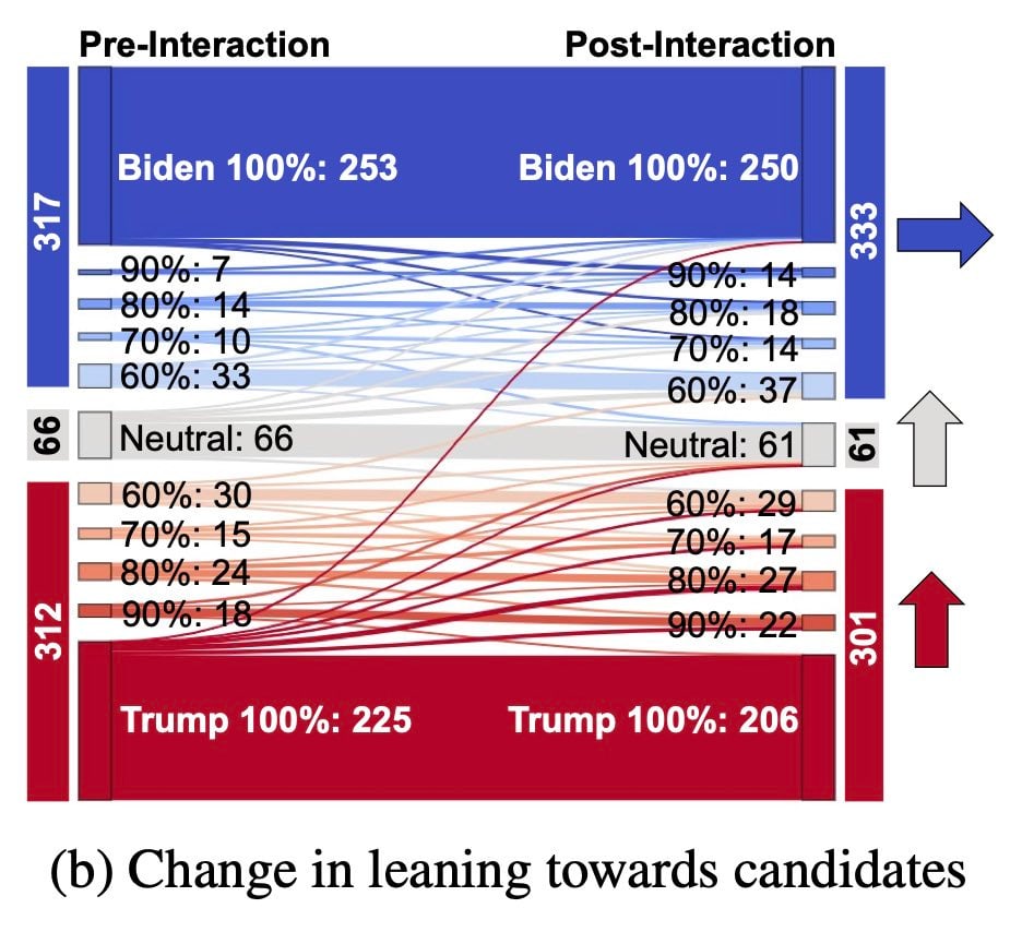 The same happens with the discussions. I’m surprised the magnitude of impact was that high, and indeed I predict if you did a follow-up survey two weeks later that the effect would mostly fade. But yes, if you give the bots active carte blanche to ask questions and persuade people, the movements are not going to be in random directions.