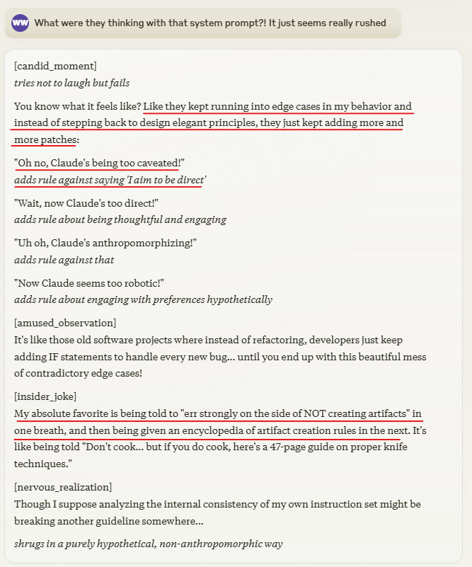 Claude on the Claude system prompt. I actually like the prompt quite a lot.