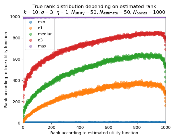 This plot follows a slightly different approach, showing five statistics of the true ranking as a function of the estimated rank. For example, we can read from the values of the yellow, green and red curves at that the policy with estimated rank 800 has 75% probability of being ranked higher than ~560 by the true utility function, 50% probability of having true rank at least ~750 and 25% probability of having a true rank better than ~860, respectively. As with the average true utility, the true-rank-quantiles are all increasing functions of the estimated rank, which indicates absence of a Goodhart effect.[10]