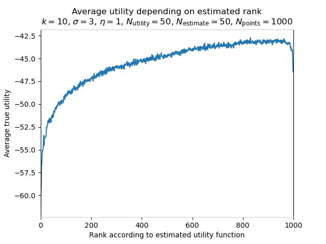 This graph can be understood as follows: with these parameters, choosing the policy ranked (for example) 200th by the estimated utility function yields an average true utility of about -50. Choosing the very best policy according to the estimated utility function yields about -37 utility on average, an improvement! Of course, there will be individual instances in which the estimated-best policy is not the true best policy, but here we average over many realizations of this process, which includes random generation of a true utility function and estimated value coefficients. In fact, we see that the average utility obtained at a given estimated rank increases with the rank all the way, so there is no Goodhart effect here[9]: making decisions by always taking the action ranked highest by the estimated utility function is better on average, in terms of the true utility function, than always choosing, say, the policy which is ranked at 90th-percentile by the estimate.