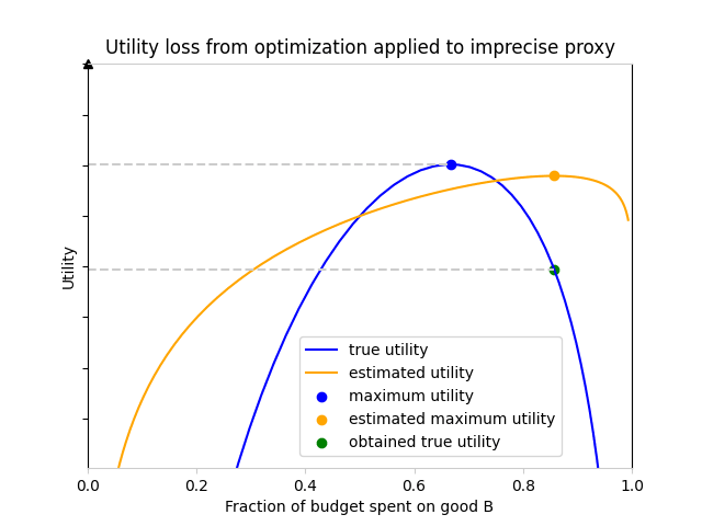 To correctly maximize true utility (the blue curve), one should choose the blue point. However, if the agent is basing its decisions on the estimated utility function (yellow curve), it will choose to spend a larger fraction of its budget on good B, because the estimated utility function values B more than the true utility function. The agent will think it reaches the utility indicated by the yellow point, at the maximum of the estimated utility function, but in fact it will reach the green point on the true utility curve. This leads to a loss in utility corresponding to the distance between the two gray dotted lines.