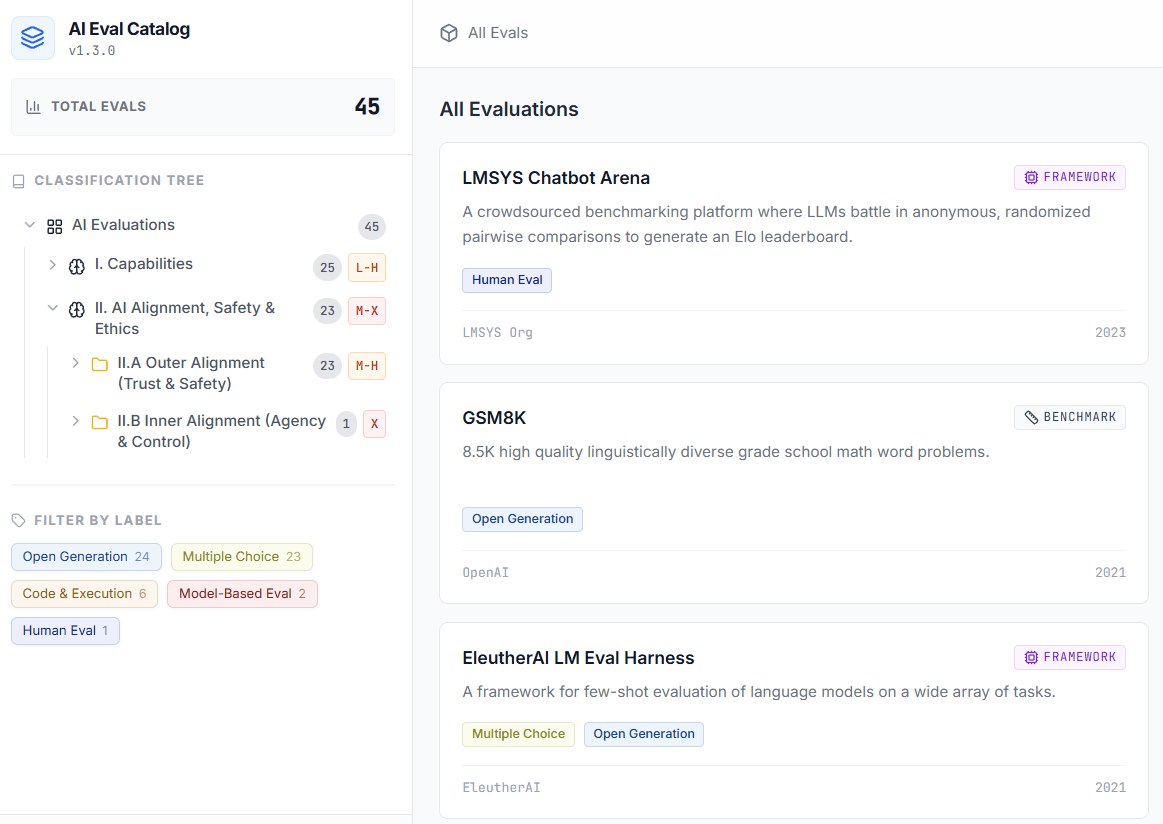 Few days back I was looking for a taxonomy and/or catalog of AI Evaluations to understand the space and the trajectory of new areas of research & development. I wanted to see where a couple of evaluation ideas I had in mind might fit.