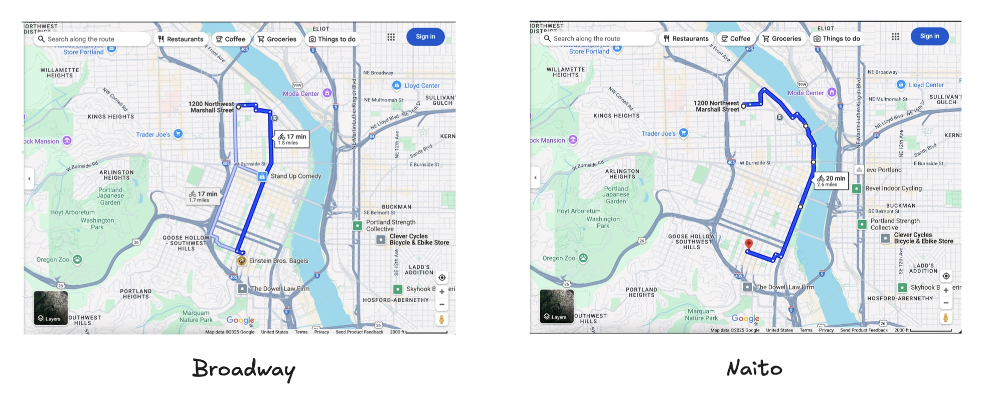 But should my goal be to get downtown ASAP? Shouldn't I also think about how dangerous a particular route is? How comfortable it is? How pleasant and scenic it is? I certainly care about all of those things and after factoring them in, prefer Naito despite it taking an extra three minutes.