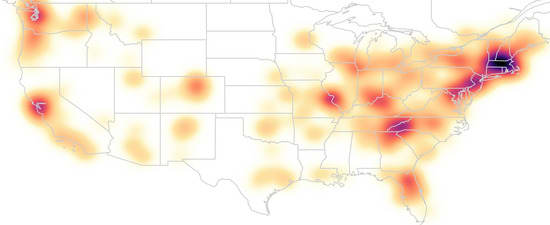 About ten years ago I made a heatmap of contra dances, which I've kept up to date. I recently had a request from someone who'd like to print out a copy for a poster, and while the one I built on the Google Maps API doesn't have a way to generate a high-resolution version it seemed like fun to make one from scratch: