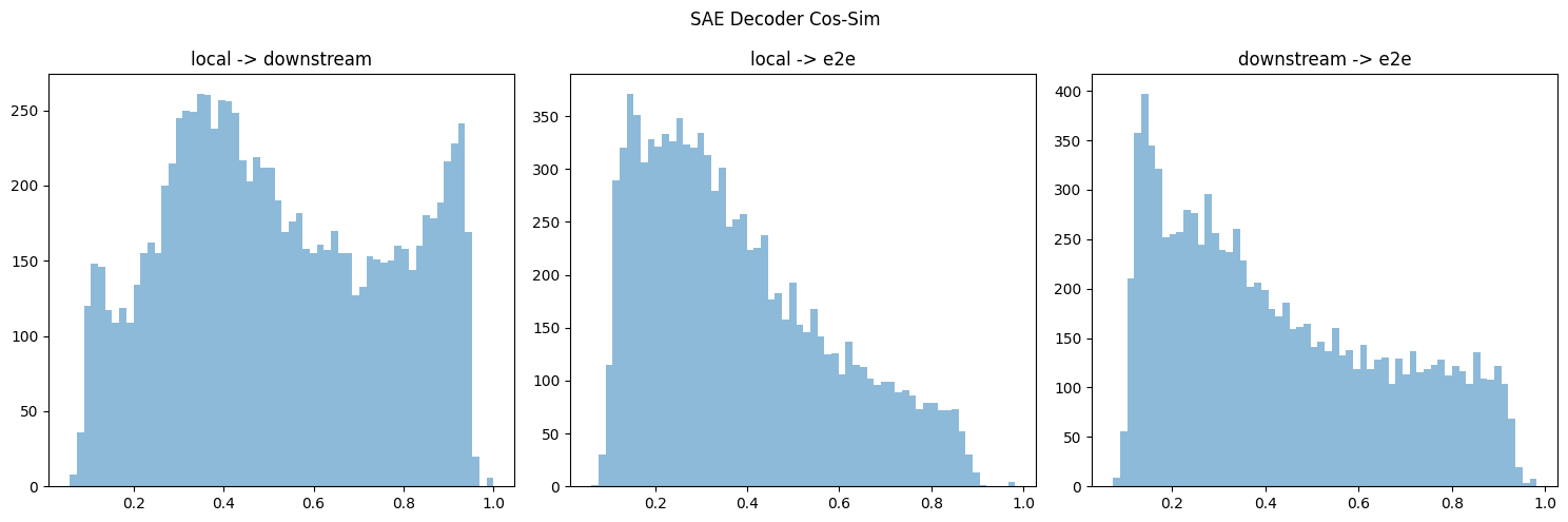 2. Unlike local SAEs, our e2e SAEs aren't trained on reconstructing the current layer's activations. So at least my expectation was that they would get a worse reconstruction error at the current layer.
