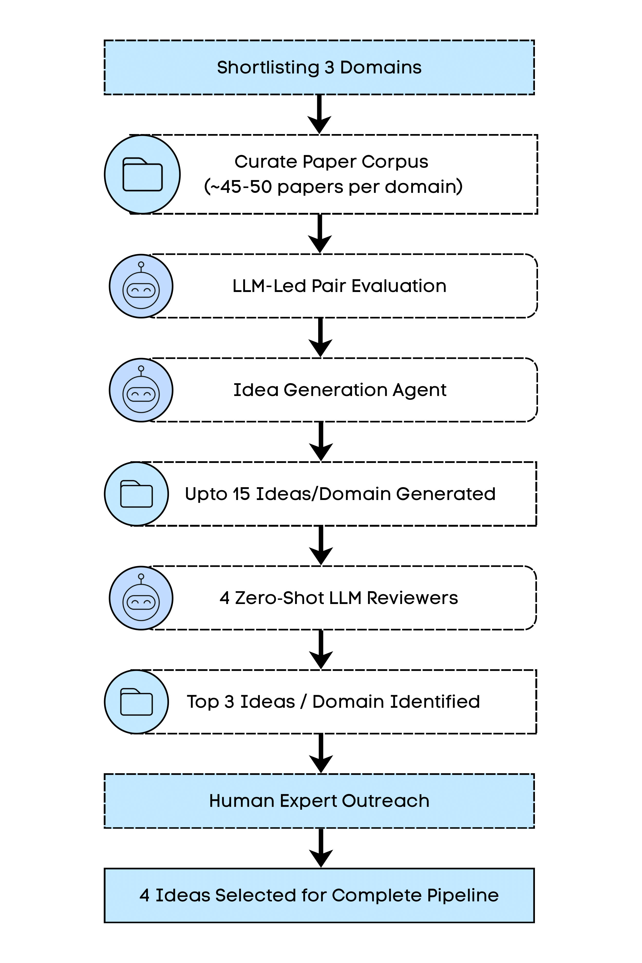 To select research ideas, we started with a corpus of 135+ papers from top-tier venues across three ML subdomains: World Models, Multi-Agent RL, and AI Safety. After running four zero-shot LLM reviewers and consulting authors of the seed papers for feasibility input, we narrowed to four candidates for full pipeline execution.