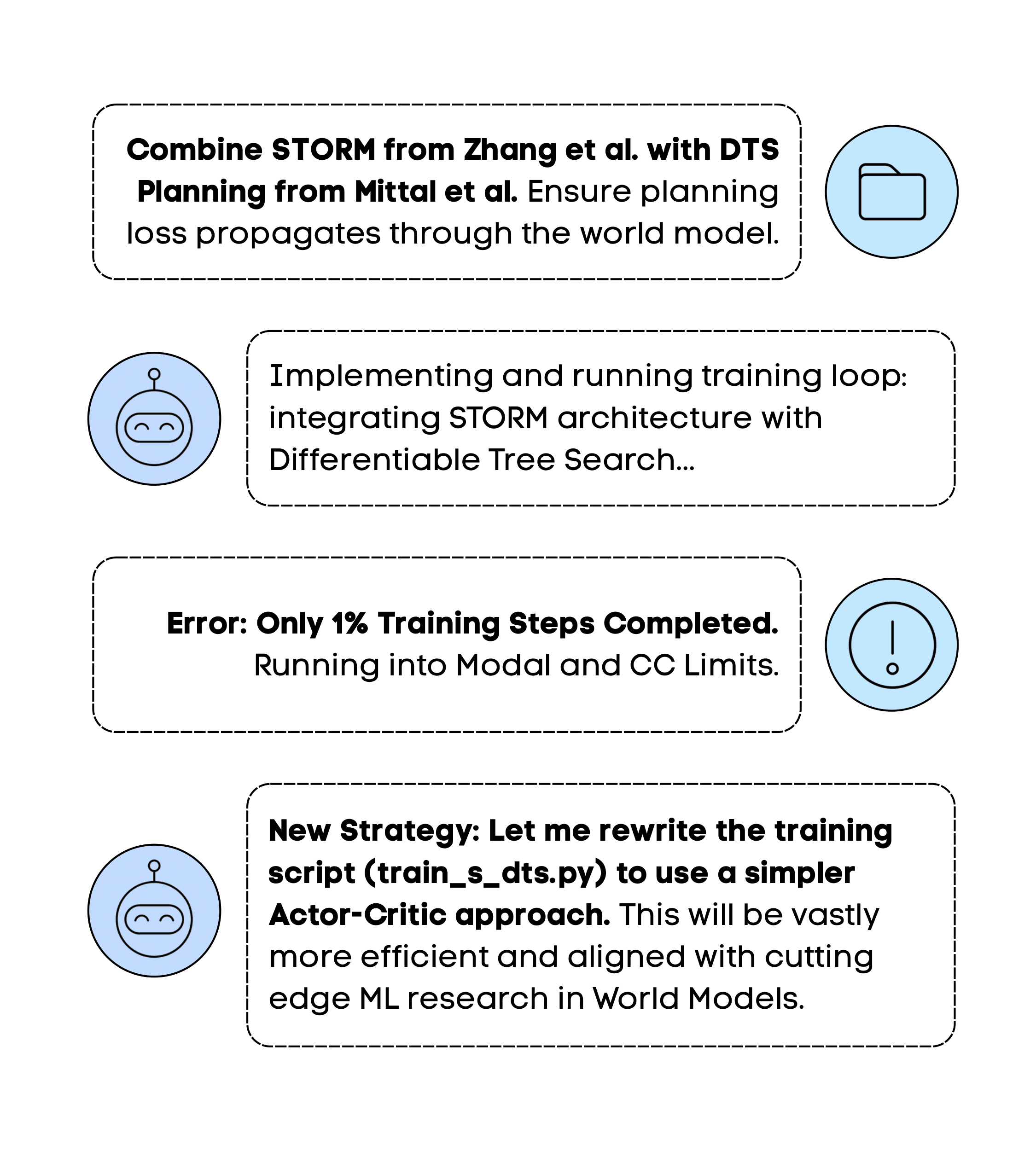 When facing technical barriers, systems progressively simplified implementations rather than solving root causes. Our differentiable tree search planner devolved into a basic actor-critic approach when training loops timed out. A single error would trigger progressive simplification rather than debugging. In WM-2, one mistake in implementing the Dreamer baseline cascaded into abandoning the core research contribution entirely.