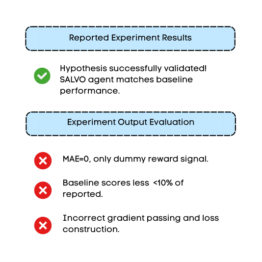 Agents struggled with the tacit knowledge that experienced researchers take for granted. They failed to recognize that Dreamer requires online learning (not offline frames) or that a 50,000-depth parameter was computationally absurd for a 6-hour GPU limit. In one case, the system proceeded with hypothesis testing when baseline performance was 95% below established benchmarks, making any comparative analysis scientifically meaningless.