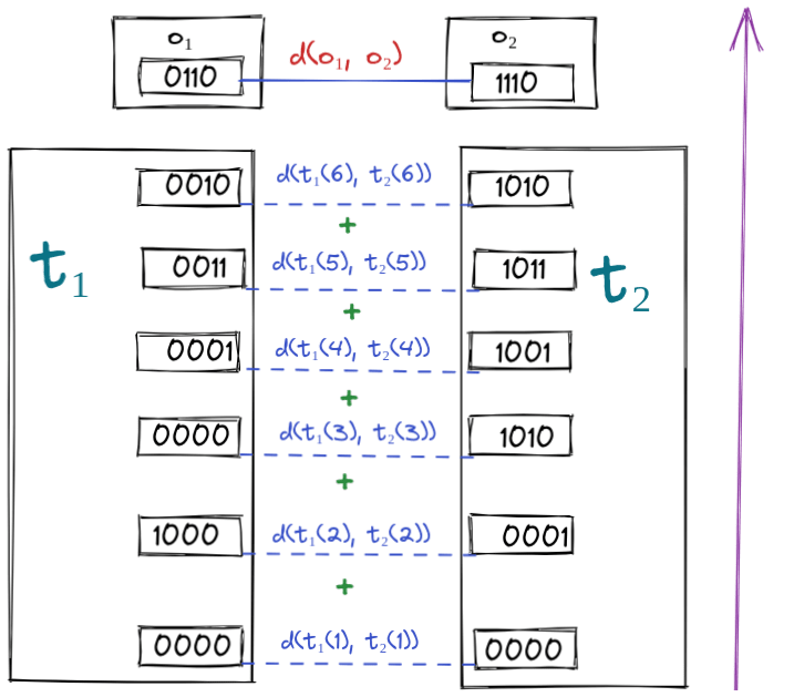 The fundamental idea is that we first (red) compute the distance of the two outputs. We then go backward through the trace of the two programs, (green) adding up the pairwise (blue) differences of the traces at each timestep, potentially (purple) discounting the differences the farther they lie in in the "past" of the output/further towards the start of the computation.