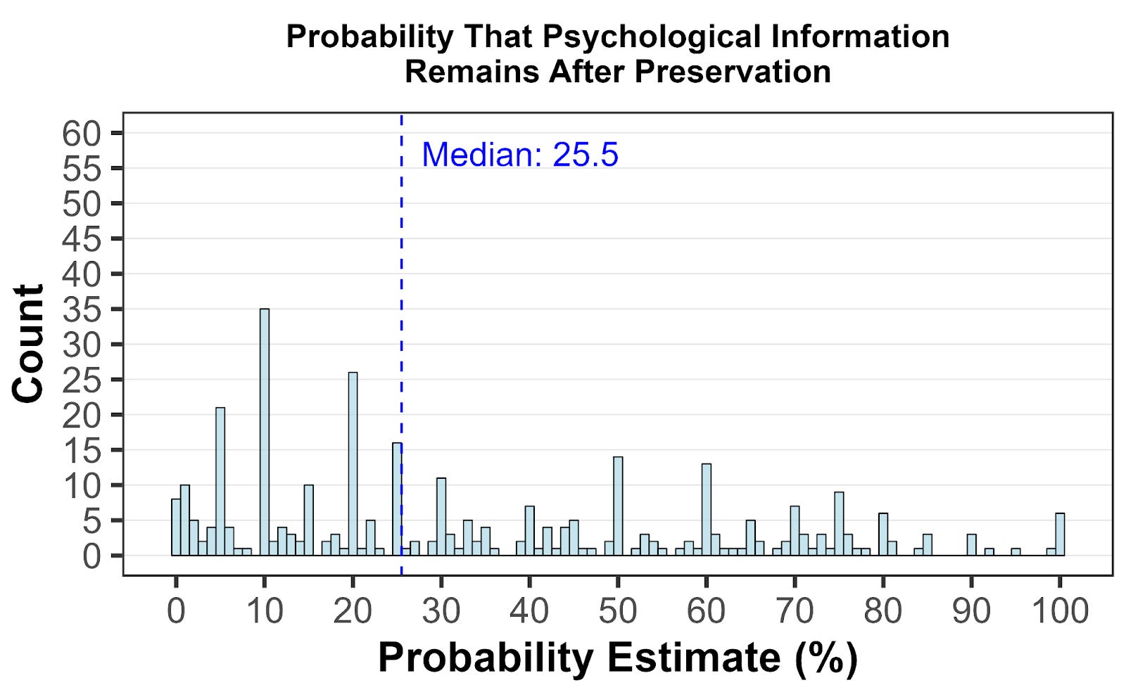 Last year, Andrew McKenzie, Emil Kendziorra, and I surveyed 312 neuroscientists about the neurophysiological foundations of memory and whether preservation could enable indefinite memory retention. We found the typical respondent believed there’s a 40% probability that a well-preserved brain retains its long-term memories and could eventually be uploaded1 (publication, blog post, news article).