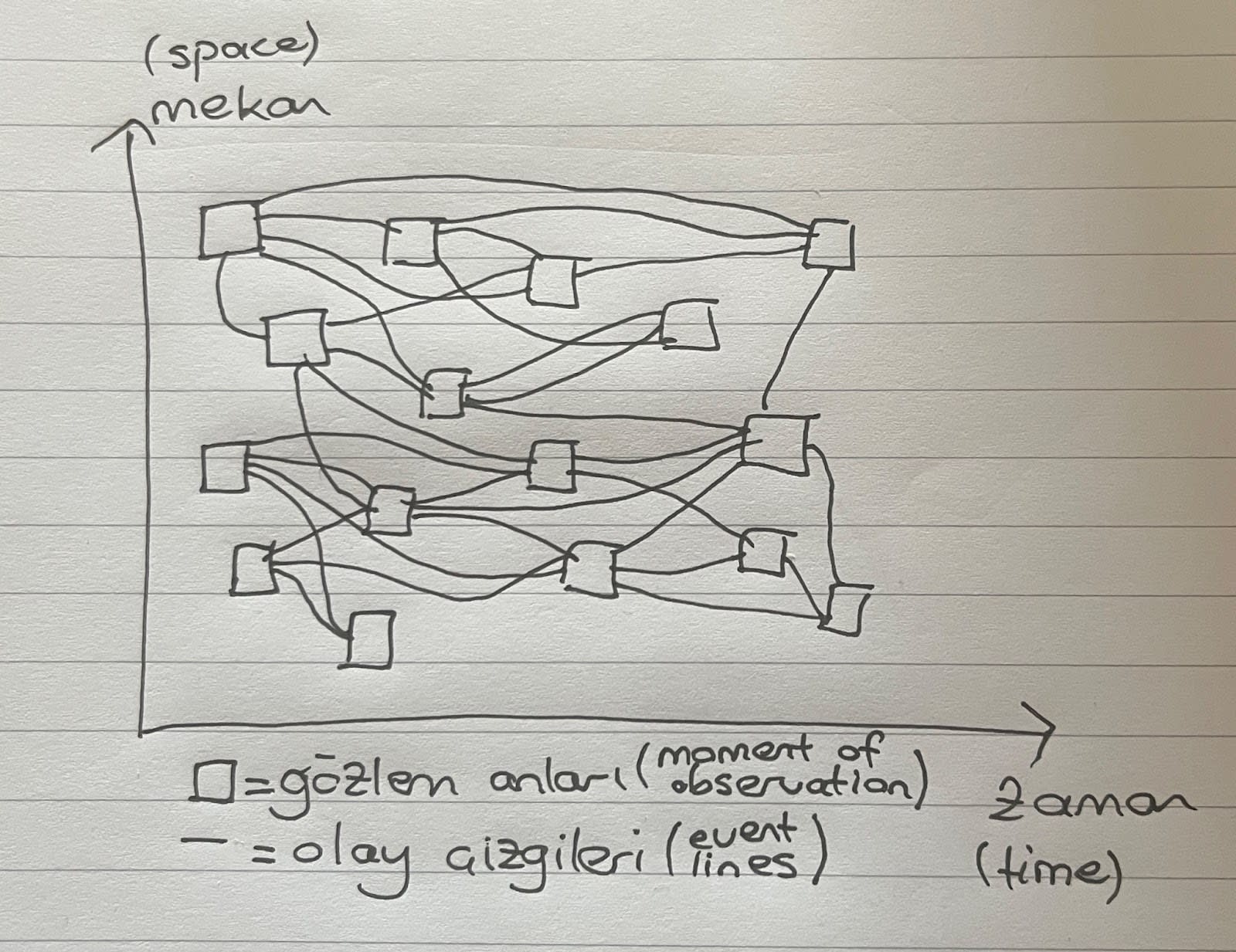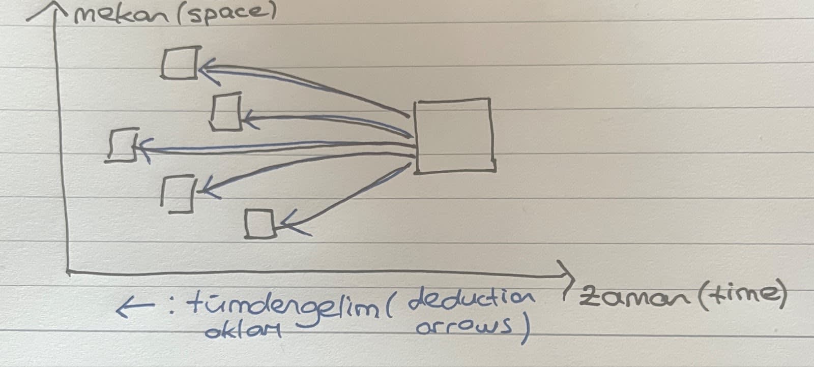In the graph, the horizontal axis represents time, the vertical axis represents space. The lines represent the paths of events in nature. The mind intersects one of these curves at a certain moment, and these intersections are represented by squares. The intersection is the “moment of observation.” However, the moment of observation is not the beginning of the event, but only the moment when it comes into contact with the mind. However, the event has already happened. At this point, the mind stops what is happening; then it applies deduction by tracing back (as seen in the graph below), then comes from the past it has gone to, in short, it breaks down the event and reconstructs it. Perception is not simultaneous with reality; it always follows it.