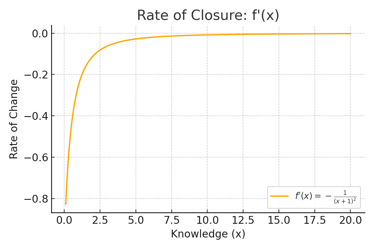 As you can see, the derivative of the creator function tells us how fast the gap is closing, and as you can see, the closing is ever slower. As systems accumulate knowledge, the speed at which their questions are solved slows down. Insight turns into friction. Progress requires effort. Systems slow down not because they fail, but because they approach unattainable clarity.