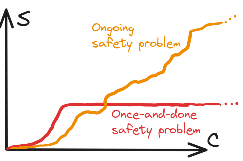 We can represent these cases diagrammatically. Suppose that for a given capability level C of a potentially-dangerous technology, we need a safety level S to avert the risk (these could be thought of as tracking the total investments made in capabilities and safety). Then when we graph S as a function of C, in the case of a once-and-done problem, at some point (i.e. after the solution is found) it plateaus, whereas in the case of an ongoing safety problem it keeps climbing forever: