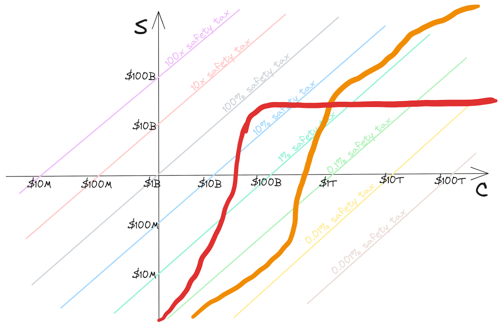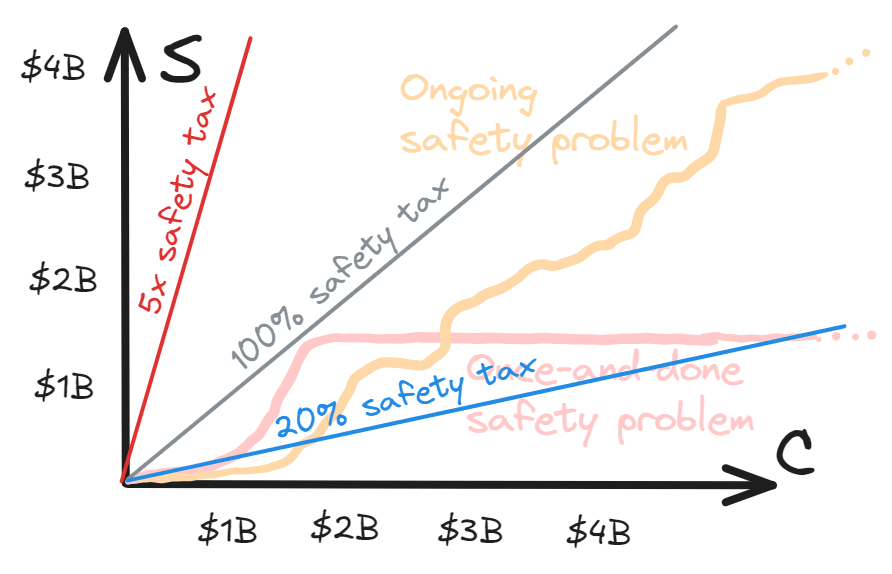 This has the advantage that both dimensions can be measured in units of a common resource of inputs (e.g. dollars, or researcher-months).[1] So now we can talk about the idea of a “constant safety tax”, meaning a constant ratio between the two: