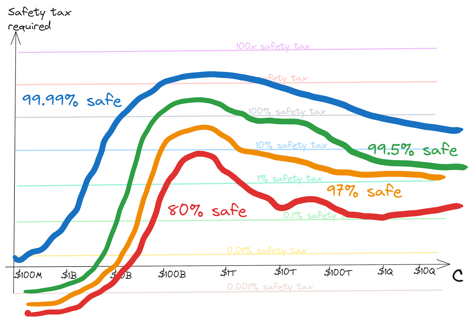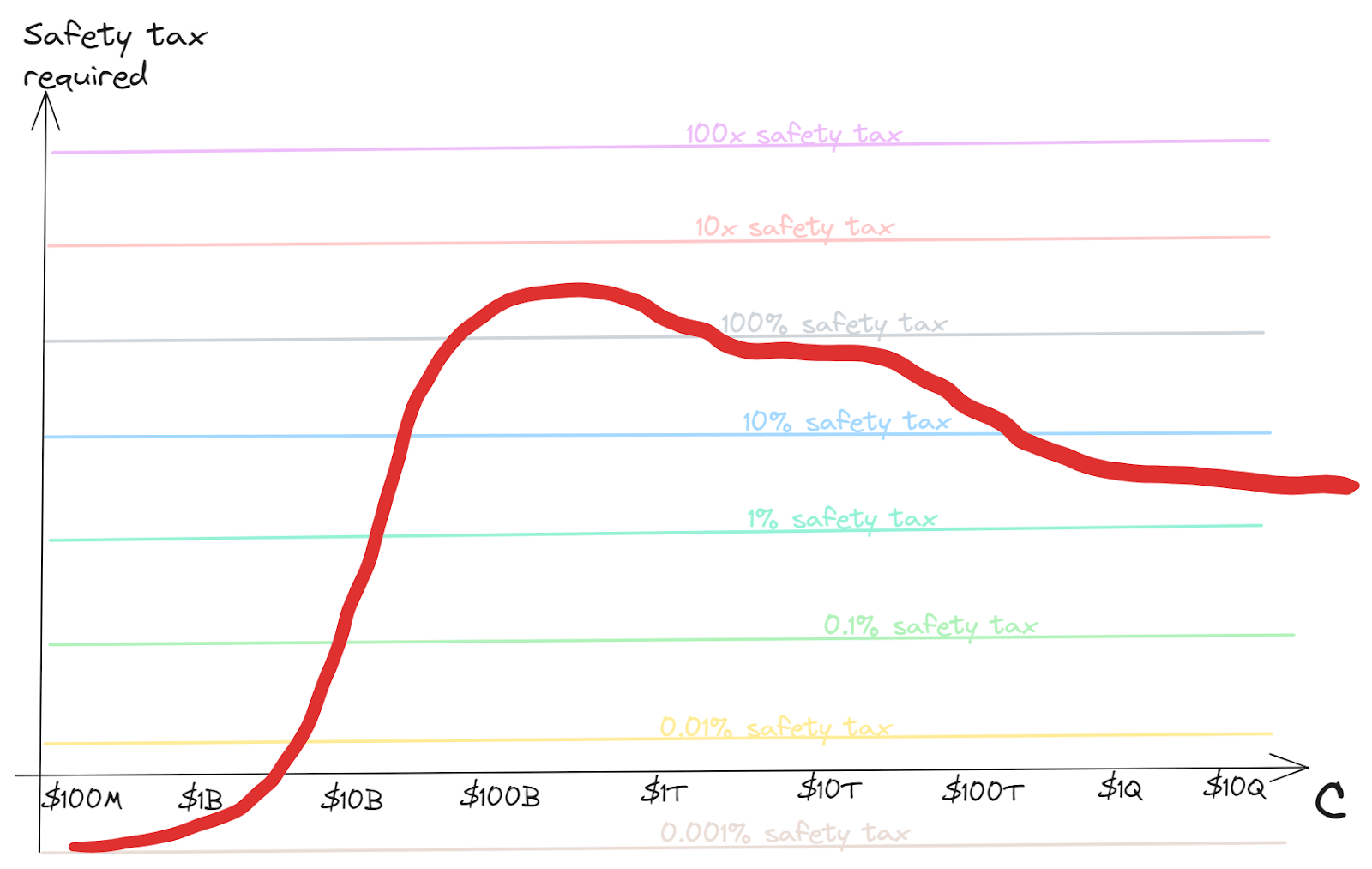 The higher the total ratio of investment in safety:capabilities ever needs to get, the harder this seems. If we never have to pay more than 0.1% safety tax, we should have a relatively easy time of it; if we have have to pay 1000x we’re going to need some very serious coordination