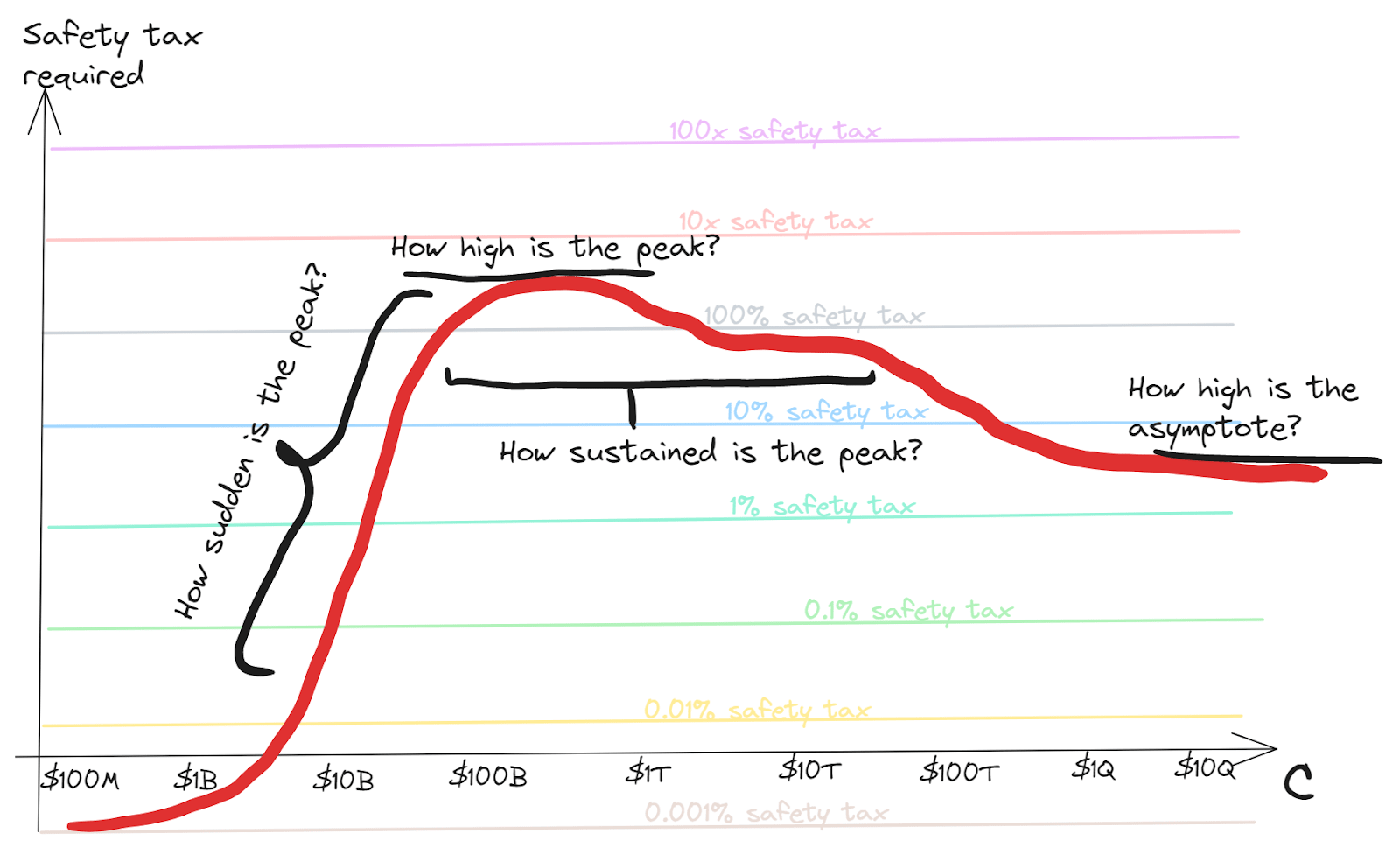 In a follow-up post, I’ll look more specifically at my picture of the safety tax landscape for AI — arguing that it’s unusually dynamic (in the sense that specific advances in AI might change the available tradeoffs), and that the peak safety tax requirements probably come in the period when AI is mildly- to moderately-superintelligent.