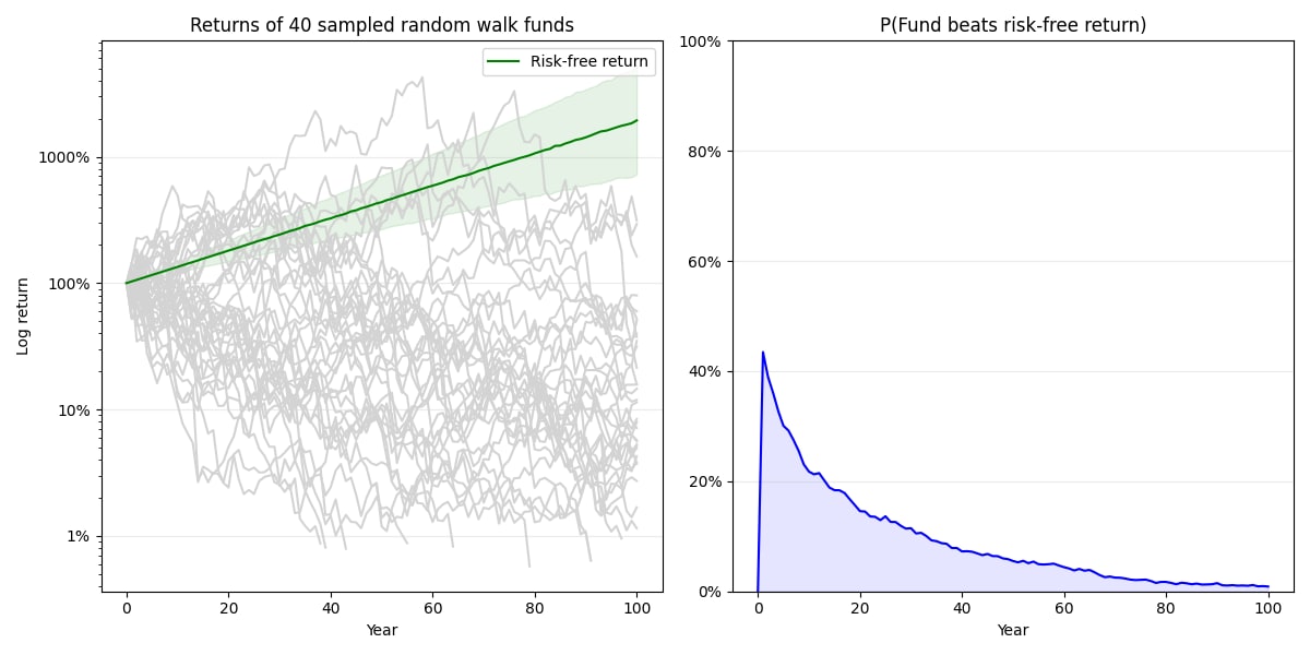 Renaissance likely is able to consistently find alpha, but a lot of what looks like alpha is probably only happenstance or survivorship bias. What would you expect to see if, each year, every hedge fund had an equal chance of making a profit and a loss? If you simulate 1K hedge funds, each of which has an annual profit sampled from a normal distribution around 0% (90% CI: -40% to +40%), you get the results shown below. In particular, the plot shows the returns[5] for these funds over time (compared with a risk-free return of +2% to +4%). Note the log scale. After 20 years, the probability that a fund outperforms the risk-free return is 16%; after 40, 7%; and after 60 years, 5%. Despite a pure coin-flipping strategy, 50 of the 1K funds will still beat the risk-free return six decades out.