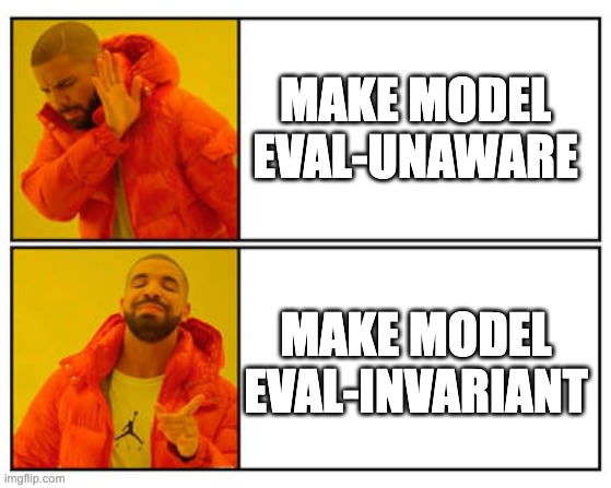 To be clear, I am not claiming making models eval-invariant is easy, although I do have a vague intuition that it would be easier than making them eval-unaware. Moreover, I am intentionally not including possible methodologies to do so for two reasons: 1) I don't really have concrete, well-formed ideas that I am confident in, and 2) I want the attention and discussion to be about the underlying premise and argument for eval-invariance rather than specific ways to train such models.