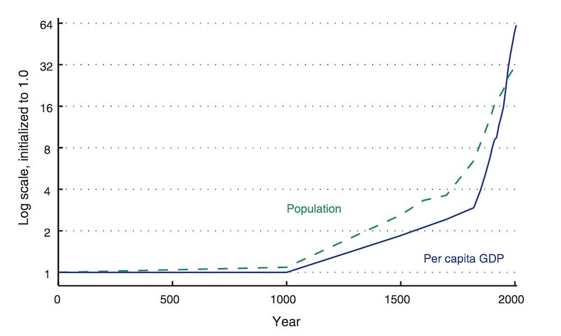 Alternative hypothesis: it’s all about Malthus trap. Humanity took off exactly when the snowball effect of knowledge accumulation start inducing more economical growth that human fecondity could compete with. I like the idea because it then explain China as well, but I didn’t start looking for hard evidence so feel free to share this kernel.