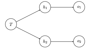 We suppose that f(T) is implemented on a simple one-layer hidden neural network, where the single input neuron corresponds to the room's current temperature, there are two neurons h1 and h2 in the hidden layer with ReLU activations, and the two output neurons o1 and o2 correspond to a1 and a2, respectively (see Figure below).