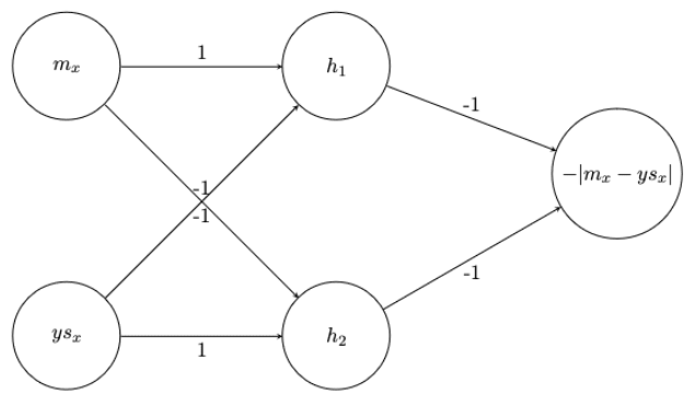 The hidden neuron values are given by: h1=ReLU(T∗−T) and h2=ReLU(T−T∗). We apply the identity to get the outputs, i.e., o1=h1 and o2=h2.