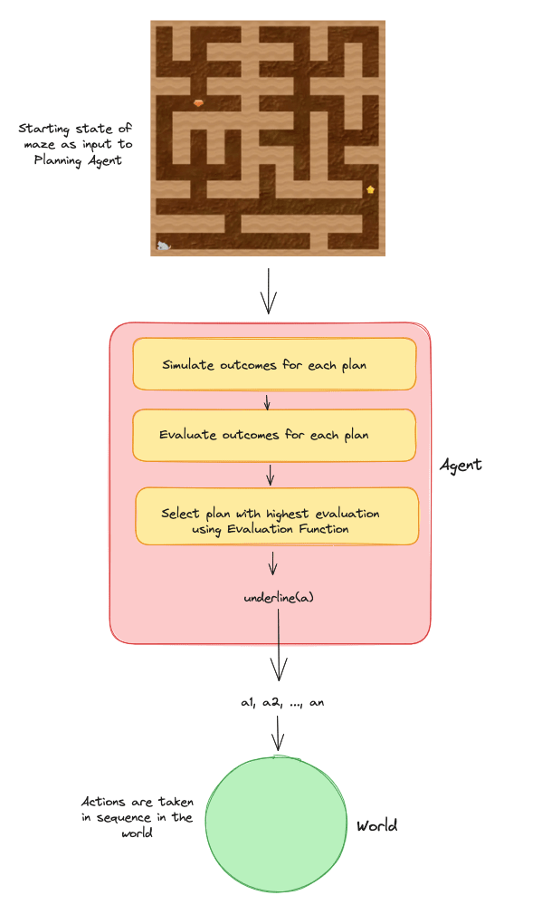 The agent receives an image of the maze and for each action sequence/plan in A≤N, the agent uses its world model to simulate the outcome of the plan. For each outcome it uses the value function to assign a value to the outcome according to how good the state is, and then finally, an argmax function is used to select the plan that leads to the highest value state.