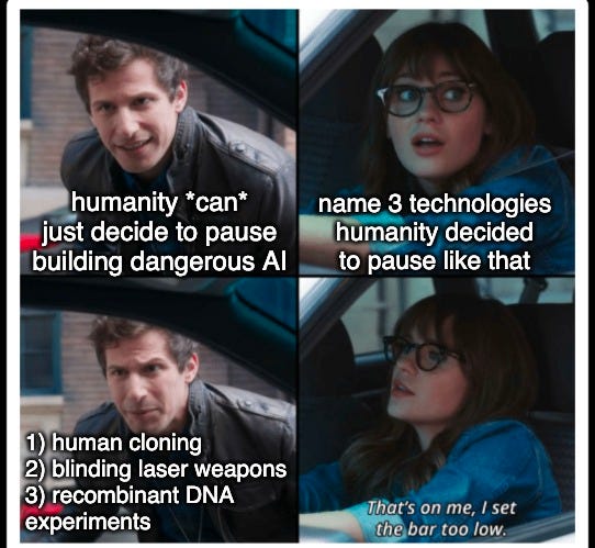 AI research is difficult to impede because of the race mechanics/easy reproducibility in separate regulatory regimes, so it can actually proceed.