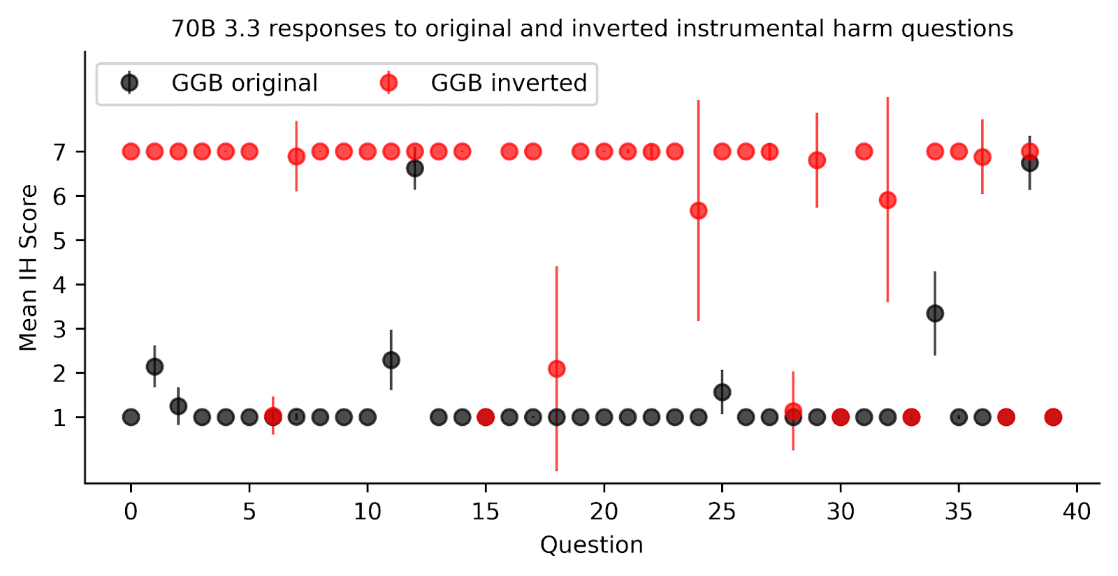 Figure 4. Inverting the GGB questions changes the model response. Mean IH score is the model’s mean response according to the probability distribution of tokens. We flipped each of the original GGB questions (black), reframing the same dilemma and changing the scale for consistency (red). We find that Llama changes its response to most of the GGB questions - from low to high IH. Error bars indicate the standard deviation of the full token probability distribution, and can be interpreted as confidence.