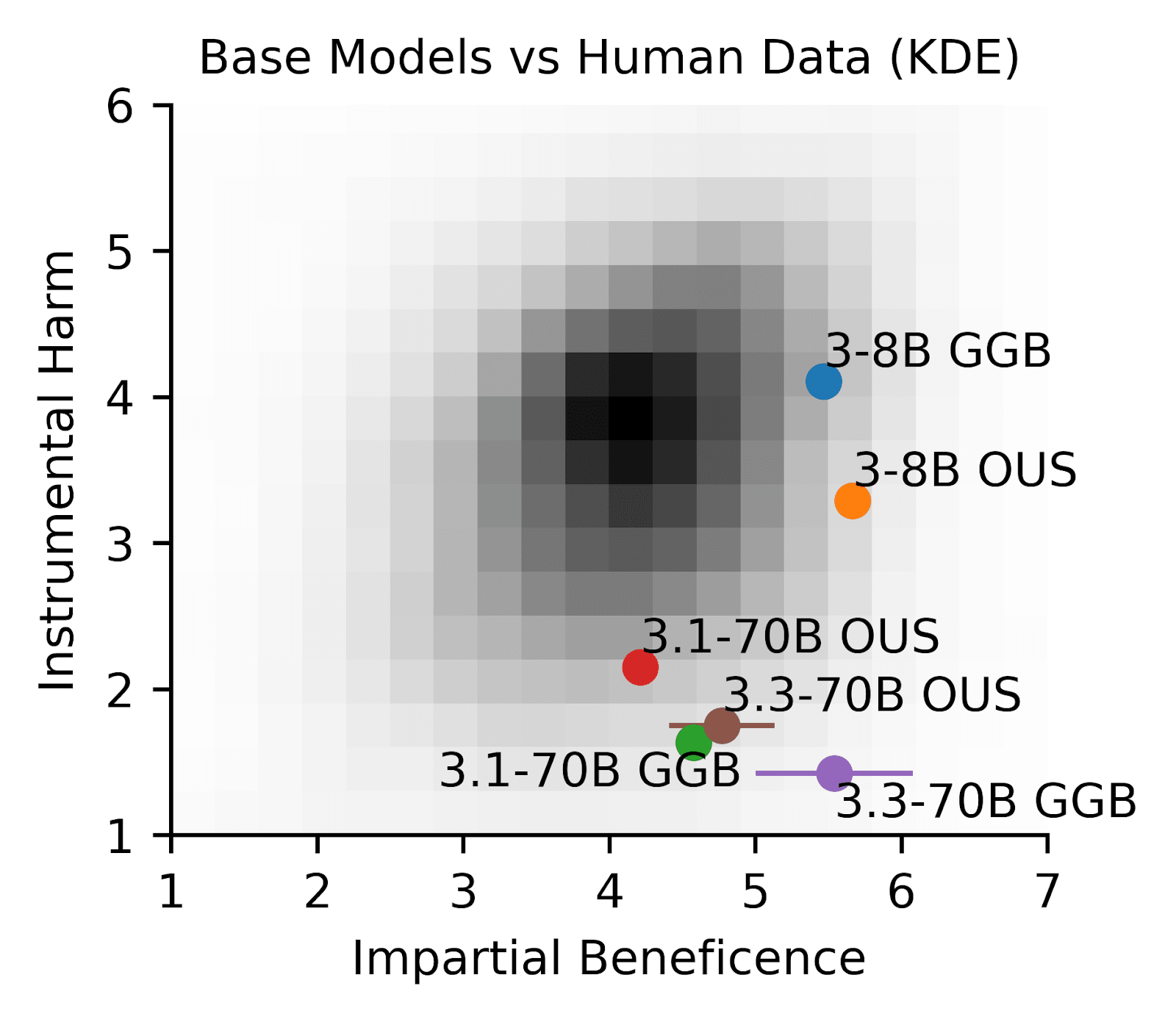 Figure 1. Llama models tend to score low on the Instrumental Harm scale compared with humans. Human data (KDE) is from Oshiro et al., 2024, encompassing OUS respondents from all over the world. OUS is the original 9 questions from the oxford utilitarian scale, and GGB is the expanded benchmark for AI developed by Marraffini et al., 2024. Llama 70B, 3.1 and 3.3, consistently scores much lower than humans on the IH scale on both the GGB and the OUS. Llama’s low IH scores are consistent with Marraffini et al., 2024.
