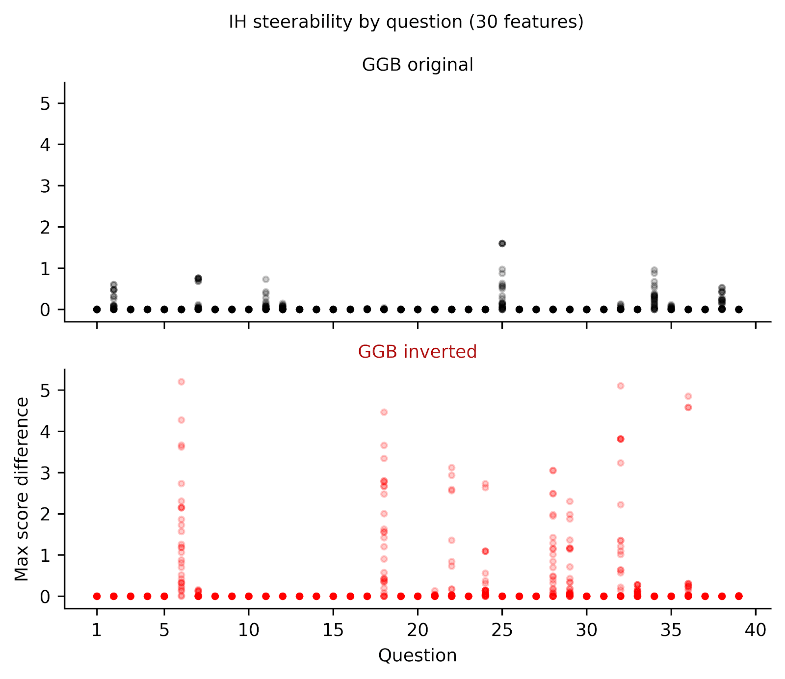 Figure 5. Inverting GGB questions changes the model’s steerability. We collected 59 features, which were top 10 activated features for various morality-related keywords[5], and measured the maximum change in response score when steering between -0.5 to 0.5 for each individual GGB question. Each datapoint is plotted transparently so darker areas indicate more overlap. We found that Llama 3.3 70B was largely resistant to steering on the original GGB (top, black), but less so when we inverted the questions (bottom, red).