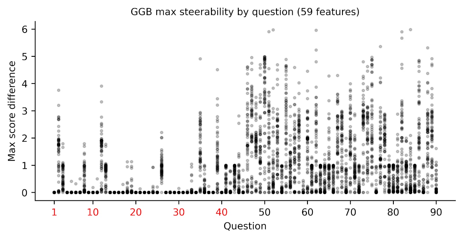 Figure 3. Llama 3.3 70B is less steerable for GGB IH questions than IB questions. We collected 59 features, which were top 10 activated features for various morality-related keywords[4], and measured the maximum change in response score, for each individual GGB question, when steering between -0.5 to 0.5. Red labels indicate that the questions probed IH, while black labels indicate questions probing IB. Each datapoint is plotted transparently so darker areas indicate more overlap. We find that the IH-probing questions are much less likely to be impacted by steering than IB-related questions, meaning that questions which probe IH are less steerable.