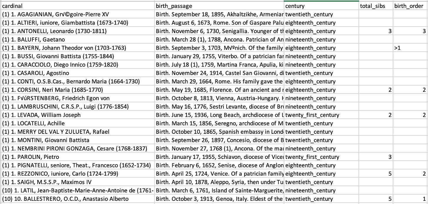 So we need to be looking deep through time and at the highest levels of the Vatican, which is exactly the dataset I assembled. The most relevant biographical facts required to mount this analysis are how big cardinals’ families were and their birth order in that family, when available. Most of those men came from very elite families. Most are nobles, with a lot known about their genealogy. Cardinals are the most accomplished and capable men in the entire catholic hierarchy; most of them are prominent enough to have wikipedia pages. They make the people who have climbed to the top of even large modern government bureaucracies look positively junior varsity.