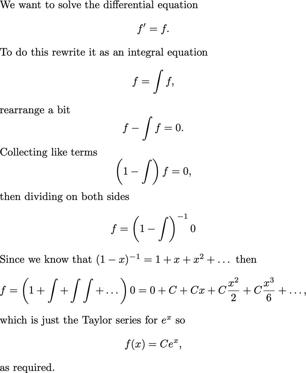 However, the integral version still works. To formalize the original approach: we define the function I (for integral) to take in a function f(x) and produce the function If defined by If(x)=∫x0f(t)dt. This rigorizes the original trick, elegantly incorporates the initial conditions of the differential equation, and fully generalizes to solving nonhomogeneous versions like f′=f+ex (left as an exercise to the reader, of course).