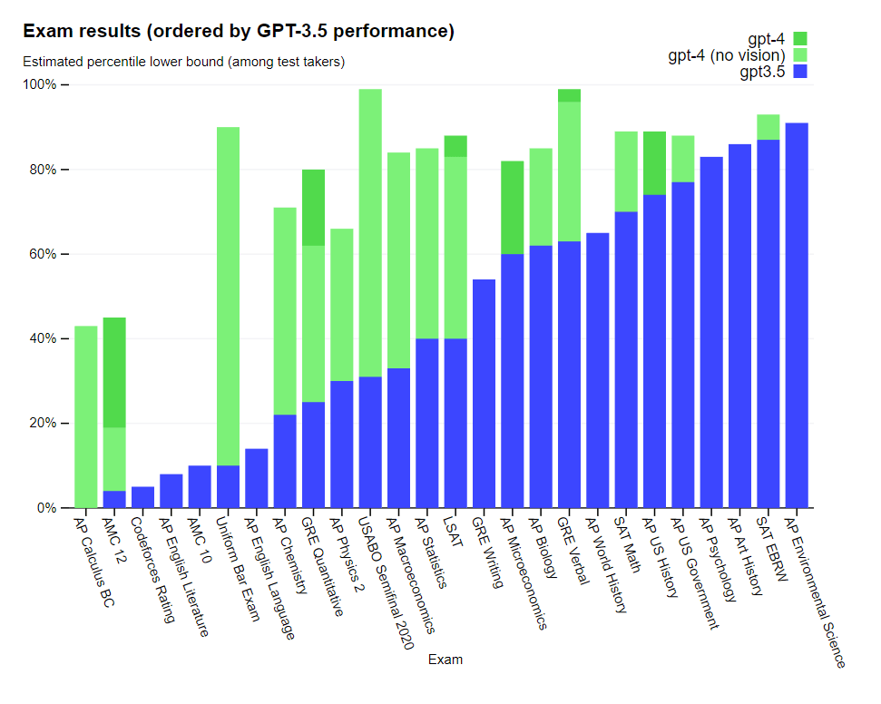 To understand the difference between the two models, we tested on a variety of benchmarks, including simulating exams that were originally designed for humans. We proceeded by using the most recent publicly-available tests (in the case of the Olympiads and AP free response questions) or by purchasing 2022–2023 editions of practice exams. We did no specific training for these exams. A minority of the problems in the exams were seen by the model during training, but we believe the results to be representative—see our technical report for details.
