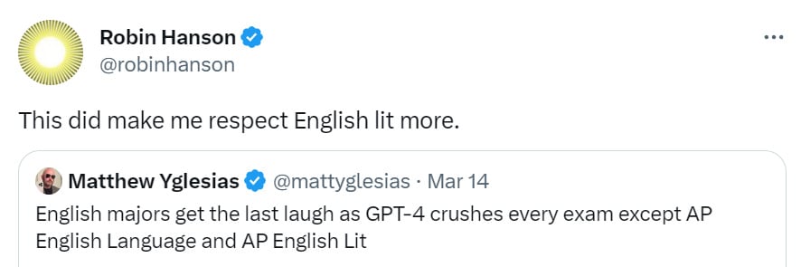 Robin Hanson, a very interesting and unique thinker who writes the blog Overcoming Bias, is an AI skeptic in many ways, as noted last week he lays out his positions here. He thinks that many digital minds (called ‘ems’) are likely to be quite human-like, but does think that in the long run artificial minds will ‘dominate the economy’ and that we can’t offer much guarantee how bio humans will then be treated. Seems like quite the understatement there.