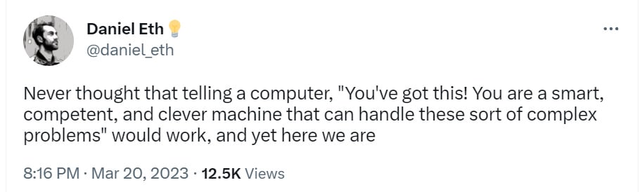 This is incredible. I would love love love it if Beff was right about this, that those saying ‘full speed ahead!’ were the scrappy underdogs and Eliezer had control over the minds of the executives determining the future of AI. That the CEO of Microsoft, who is pushing AI into every product as fast as possible, and the CEO of Google, who is pushing AI into every product as fast as possible, and the CEO of OpenAI, who is releasing tons of products and slashing prices 90% and downplaying the risks, were all people who were totally focused on the long term and existential downsides of going down the path of improving AI capabilities.