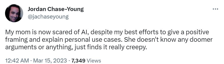 That is very much the opposite perspective, where to raise any concerns at all is uncool and difficult. That is super scary, if anyone in the circles actually working on AI feels they will lose social standing when they raise safety concerns, even on the level of ‘we need to know what we are dealing with.’ Even if you think doom is very unlikely, we still need to know what we are dealing with. Knowing what is going on is how one deals with things. Attitudes and social dynamics that silence safety concerns and information seeking are a very good way to end up without any safety.