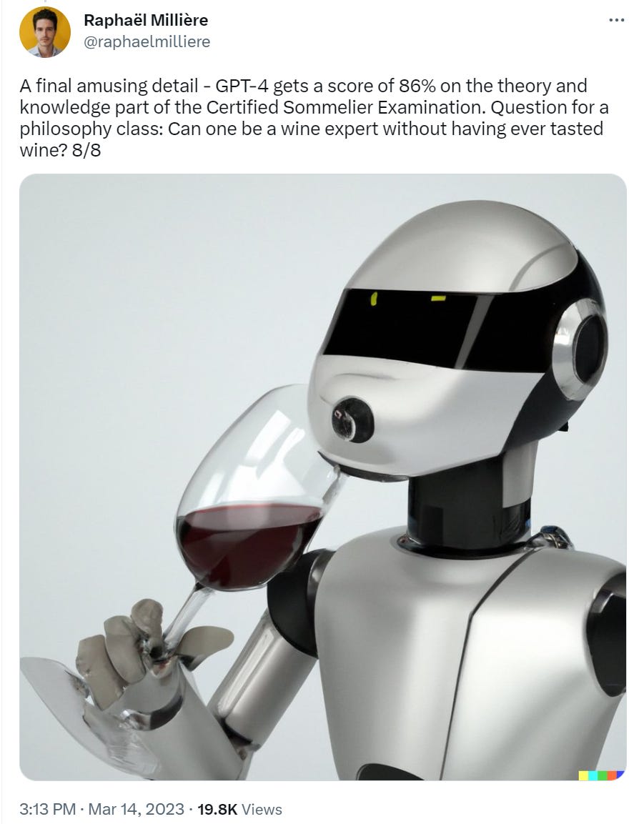 GPT-4, in this model, fails that test for the same reason I didn’t take it. If the model that knows everything and passes most tests can’t pass your test, and it is generic enough you give it to high school students, a plausible hypothesis is that the test is dumb.