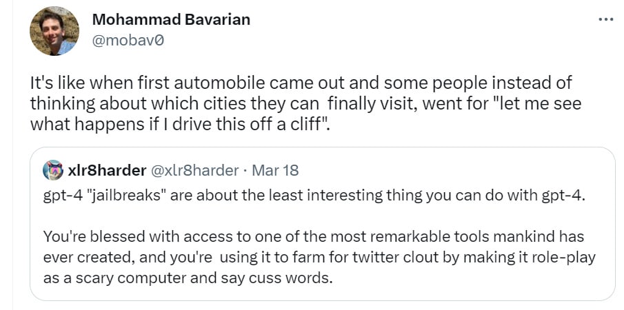 Bayeslord then says ‘I think there’s nothing wrong with doing alignment work.’ I certainly prefer that opinion to the alternative, but that is such a bizarre thing to need to say out loud. It means there are people who aren’t only pushing capabilities, who aren’t only disregarding safety, they are saying that working on make better outcomes more likely is wrong and people should stop.