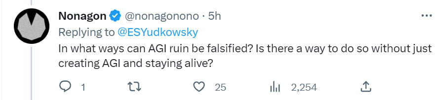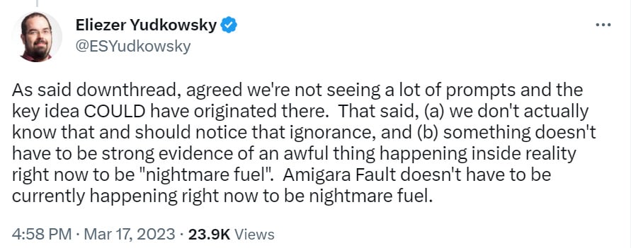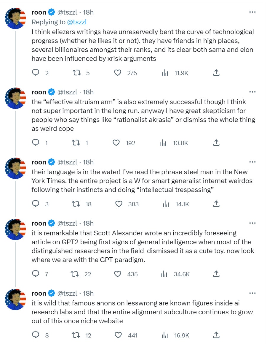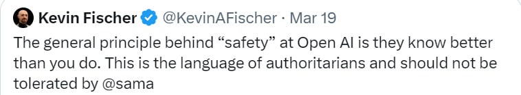 I had in fact had a convo with Elon and one or two convos with Sam while they were kicking the OpenAI idea around (and where I made various suggestions that they ultimately didn't take). There were in fact internal forces at OpenAI trying to cause it to be a force for good—forces that ultimately led them to write their 2018 charter, so, forces that were not entirely fictitious. At the launch date, I didn't know to what degree those internal forces would succeed, and I didn't want to be openly publicly hostile in a way that might undermine those efforts.