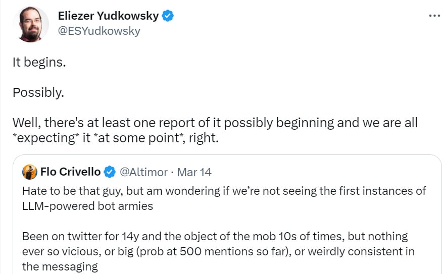 - Botpocalypse and Deepfaketown Real Soon Now: It begins, perhaps. Good news?
